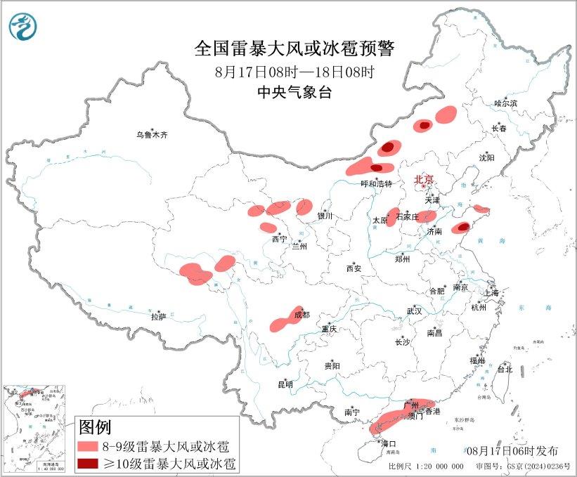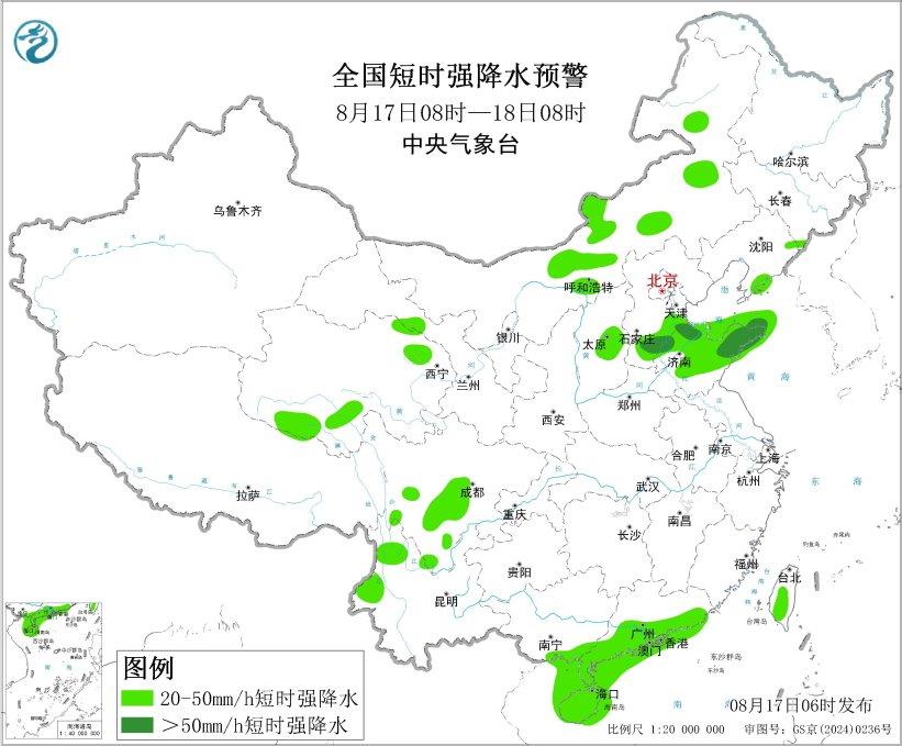 预计8月17日08时至18日08时,内蒙古中东部、西北地区中部、华北中南部、黄淮北部、西南地区北部、华南南部等地的部分地区将有8级以上雷暴大风或冰雹天气,其中,内蒙古中部、山东中东部等地的部分地区将有10级以上雷暴大风;内蒙古中部和东部、西北地区中部、华北中南部、黄淮北部、西南地区北部、华南南部等地的部分地区将有小时雨量大于20毫米的短时强降水天气,其中,河北南部、山东北部和东部等地的部分地区小时雨量大于50毫米,更大 可达70毫米以上。