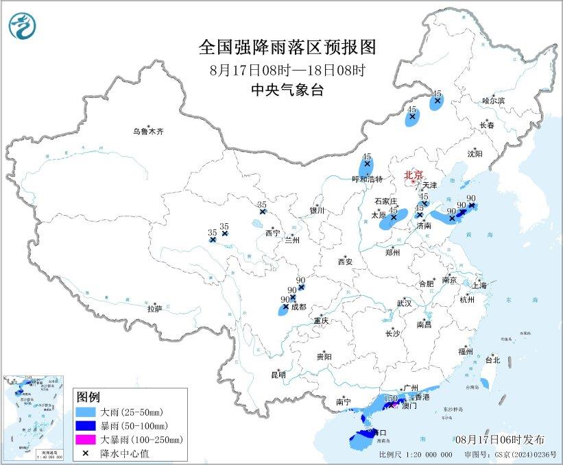 预计,8月17日08时至18日08时,内蒙古中东部、山西东南部、河北南部、山东中北部、青海中北部、四川盆地西部、广西东南部沿海、广东南部沿海、海南岛、台湾岛南部等地部分地区有大到暴雨,其中,广东西南部沿海等地局地有大暴雨(100~150毫米)。上述部分地区伴有短时强降水(更大 小时降雨量20~50毫米,局地可超过70毫米),局地有雷暴大风等强对流天气。